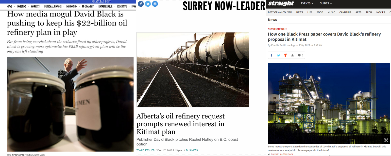 It’s not just the location of Black Press’s head office that’s at issue. It’s the company’s non-media business ventures. Black Press’s owner, 72-year old David H. Black, plans to build a $22 billion refinery in nearby Kitimat.