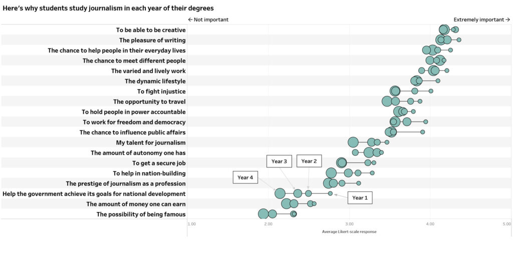 Factors such as fighting injustice and working for freedom and democracy drop after the first year. Some researchers hypothesize that first-year students have more idealistic perceptions journalism.