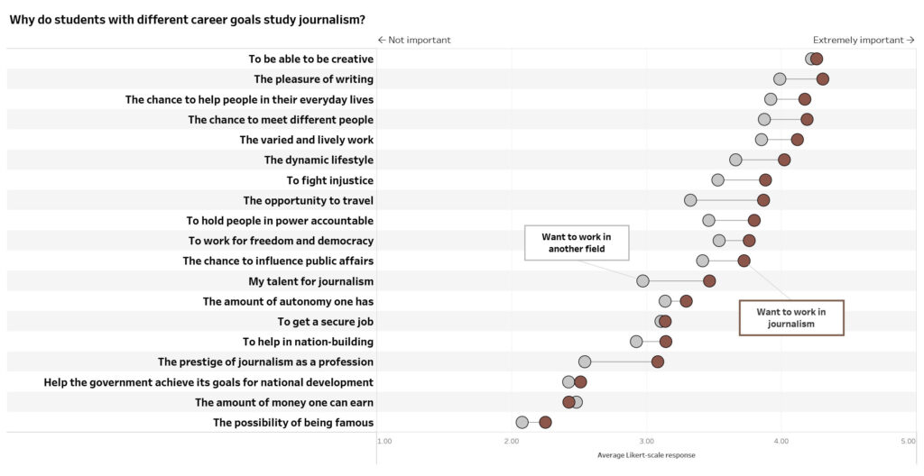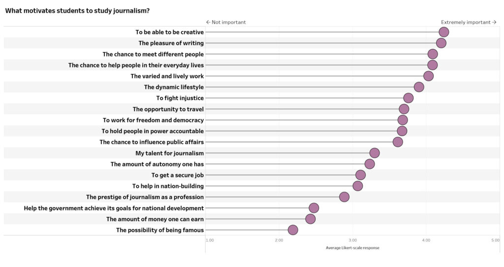 Results illustrate what has also been found in different international studies, namely that students who study journalism report being motivated more by a desire to write and be creative, as well as perceived job characteristics (varied and lively work, the chance to meet different people, dynamic lifestyle) than by characteristics associated with the role journalists are often thought to play in society (fight injustice, hold people in power accountable, etc.).