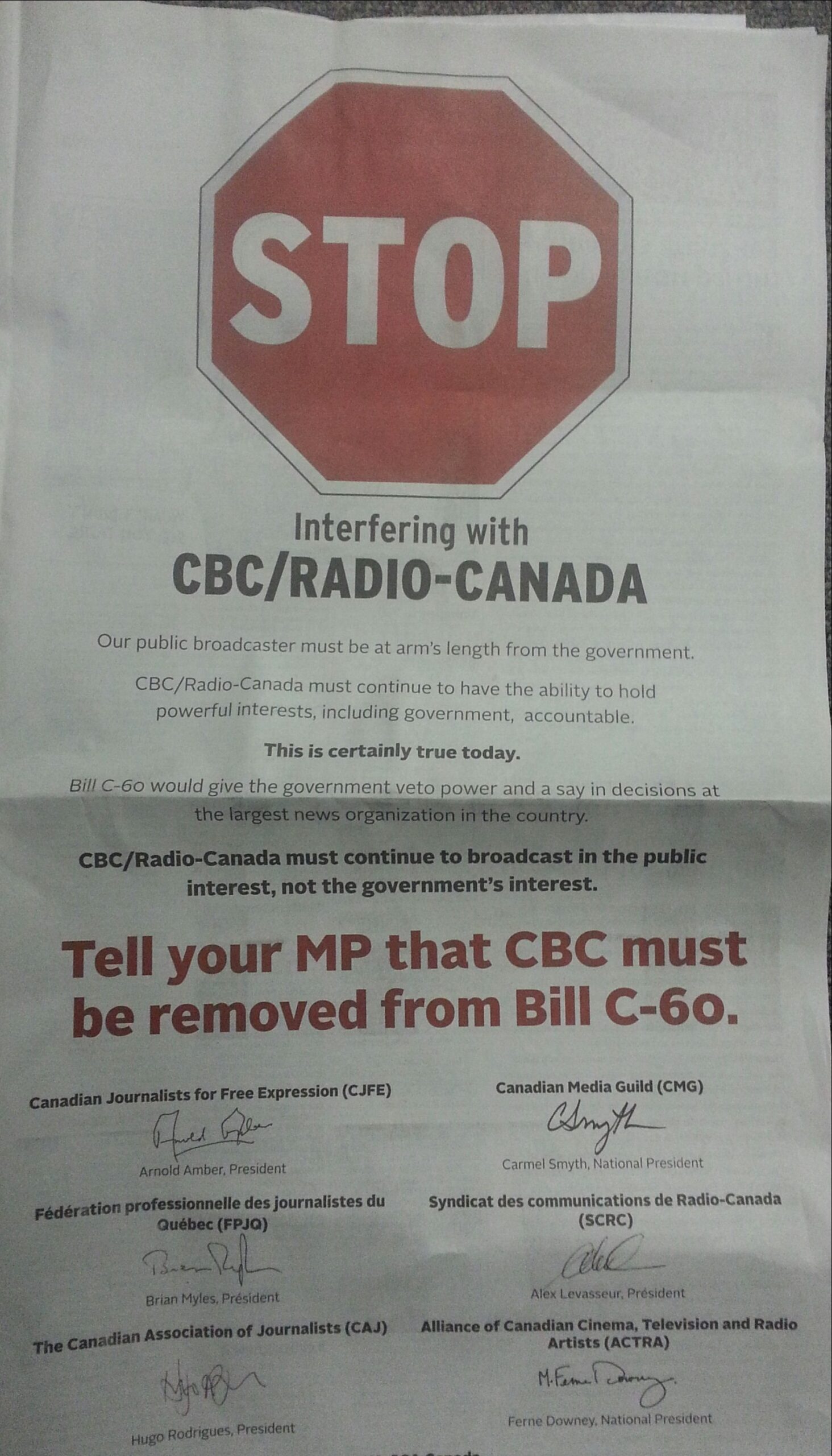 Several media organization, including the Canadian Association of Journalists and the Canadian Journalists for Free Expression have launched an advertising campaign to protest Bill C-60. “Our public broadcaster must be at arms length’s from the government,” the ad says.