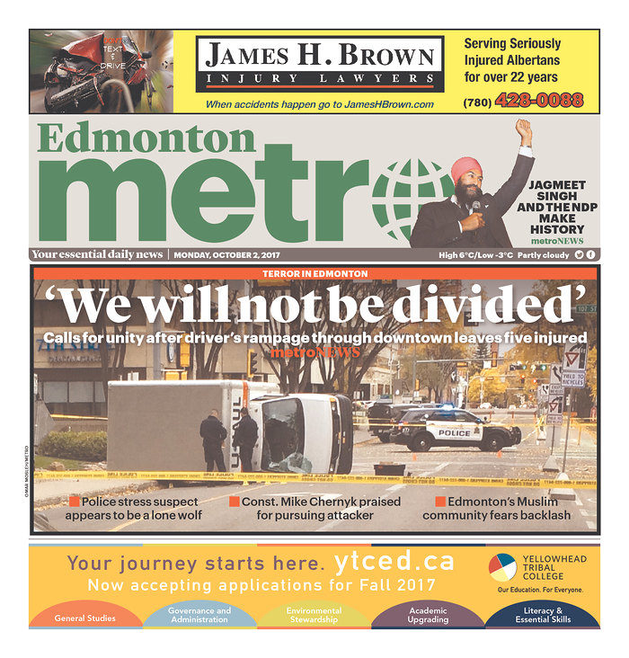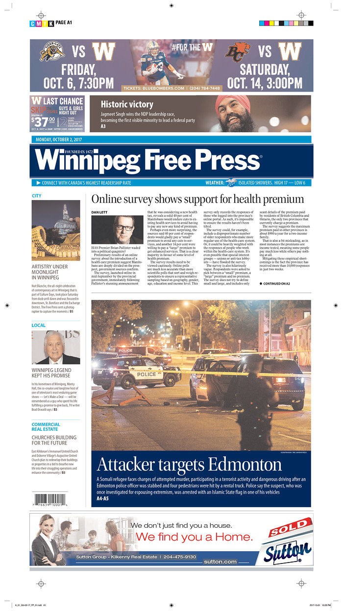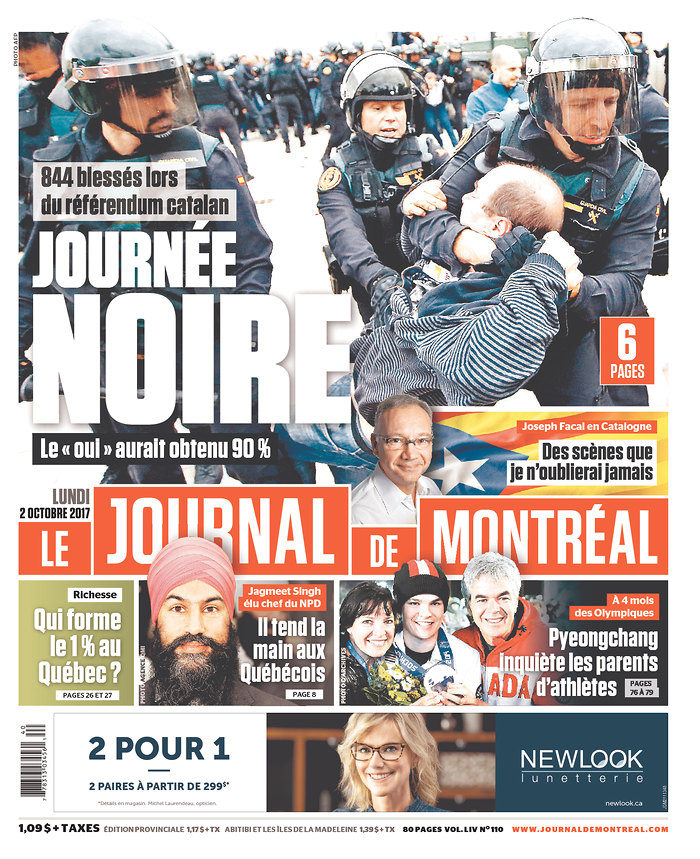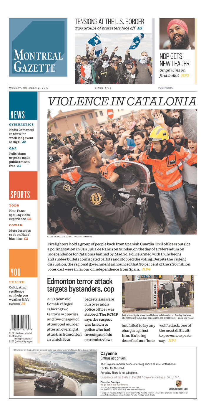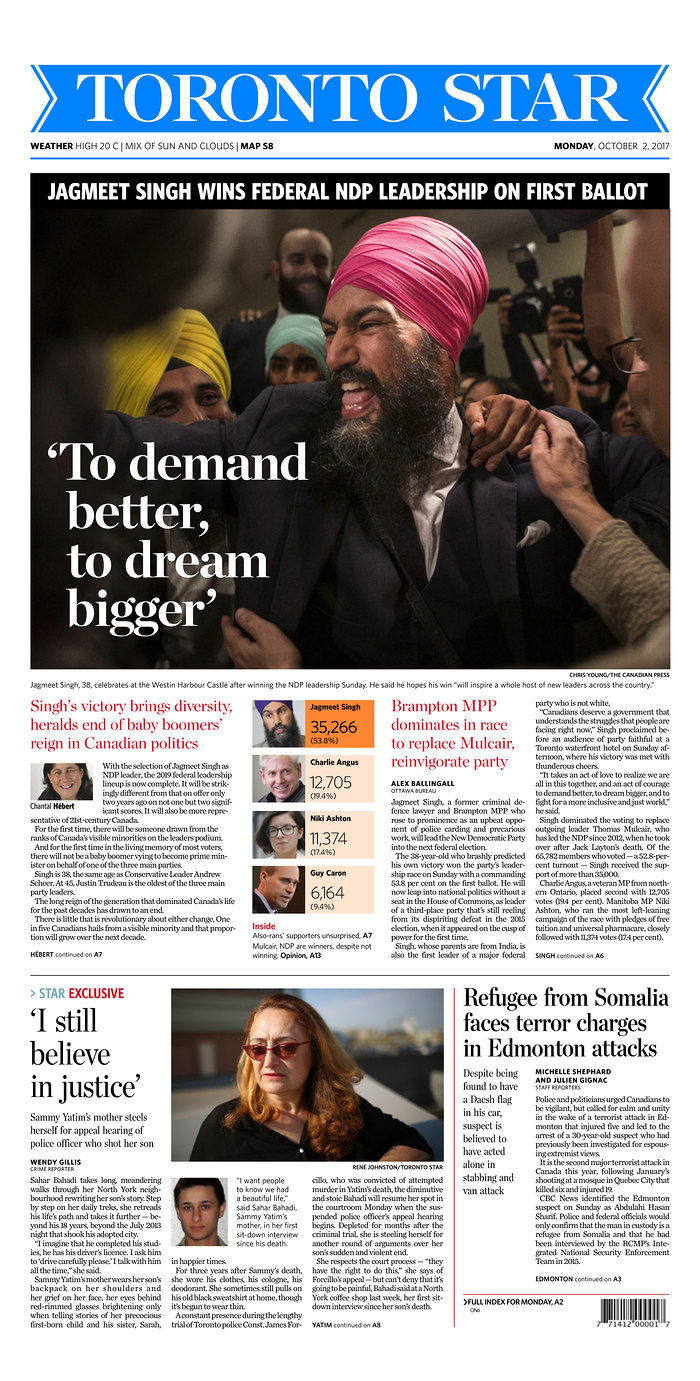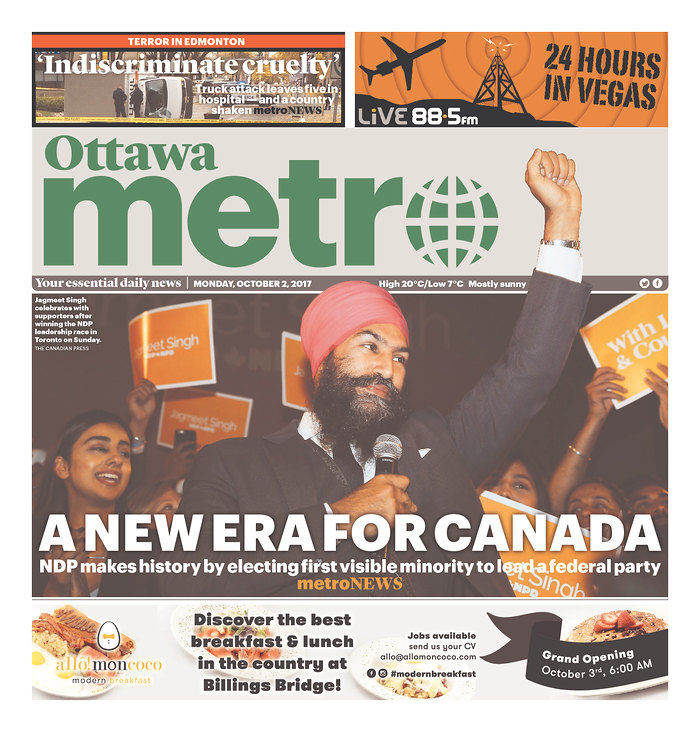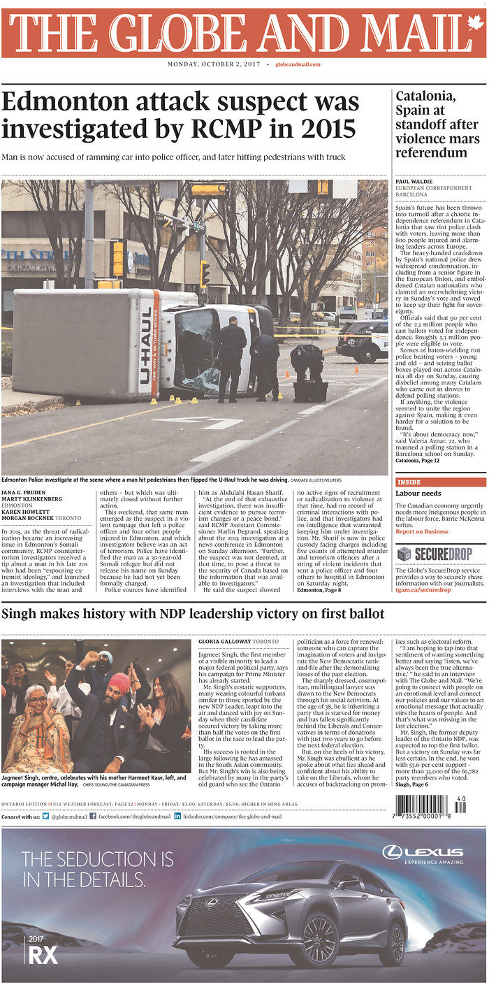 History was made on Oct. 1 as Jagmeet Singh became the first person of colour elected as the head of a federal political party. The news came during a weekend that was not lacking for major events. Two separate terrorist attacks shook Edmonton and Las Vegas, and in Spain, citizens clashed with police as people voted in the Catalan referendum. Here is how Canadian newspapers covered these stories.
