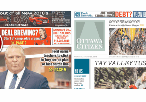 Staff from reader services and sales and in-house printing cut in “local initiative” Continue Reading 3 laid off at the Ottawa Citizen