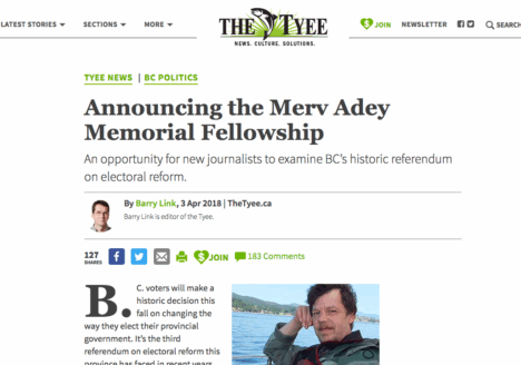 The Merv Adey Fellowship, to be hosted by The Tyee, honours the legacy of the founder of BCVeritas.com and frequent Tyee commenter. Continue Reading Bloggers and commenters fund a journalism fellowship on behalf of one of their own