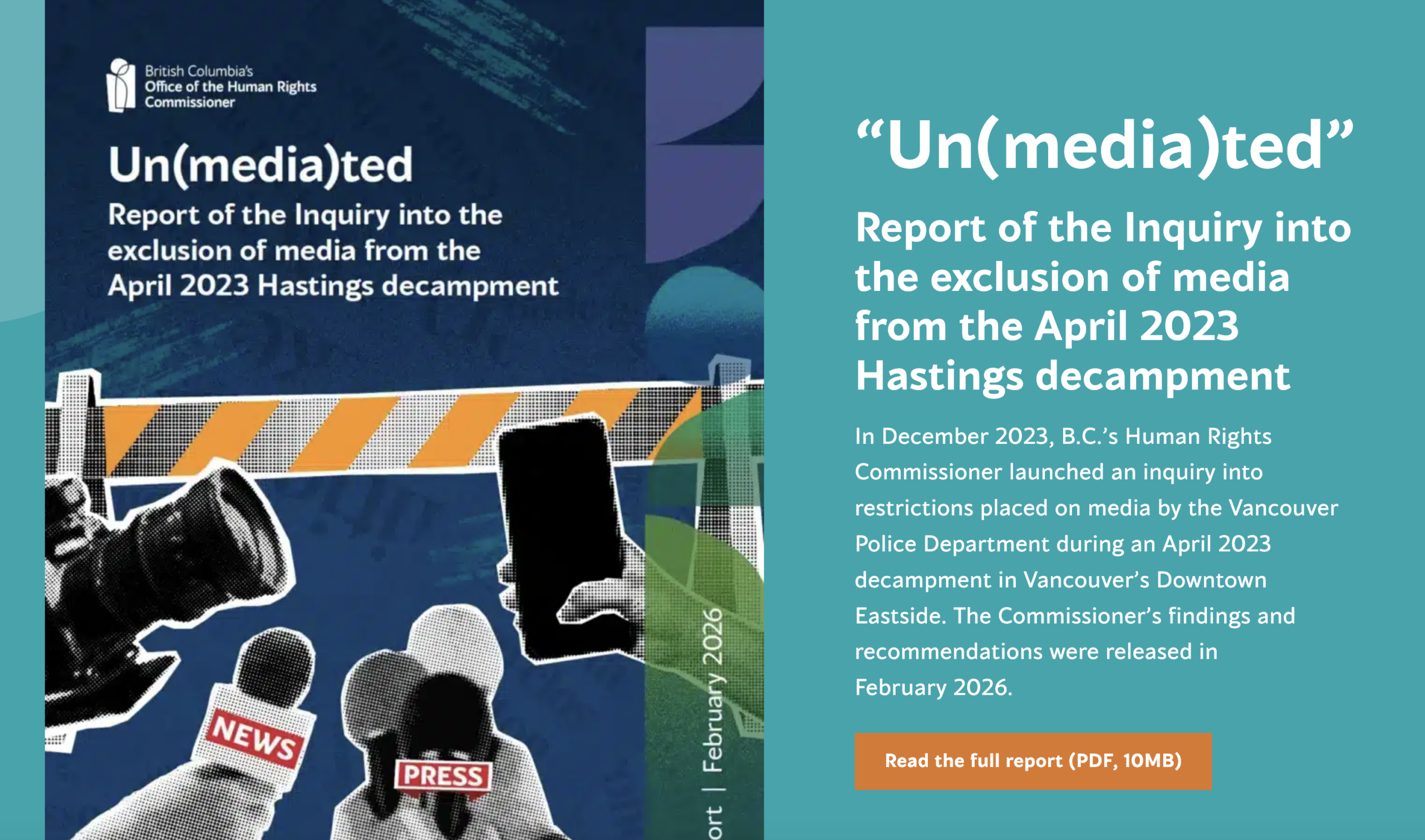 The BCHRC launched the inquiry in 2023 after Vancouver police denied access to journalists over two days while evicting people living in a Hastings encampment.