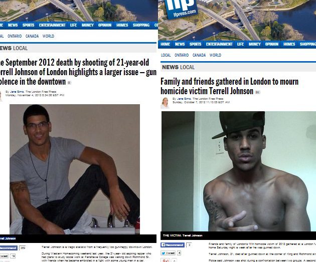 The London Free Press followed Johnson’s story from his death in the city’s downtown to the court verdict a year later. In news articles, descriptions of him were often neutral, betraying little more than his age. But click on one story and you’re greeted by a photograph of him smiling widely, wearing a grey T-shirt and glasses. Click on another and you’re confronted by a shirtless man wearing a crooked ball cap and pointing at the camera.